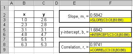 Given a set of data with n data points, the slope, y-intercept and correlation coefficient, r, can be determined using the following: